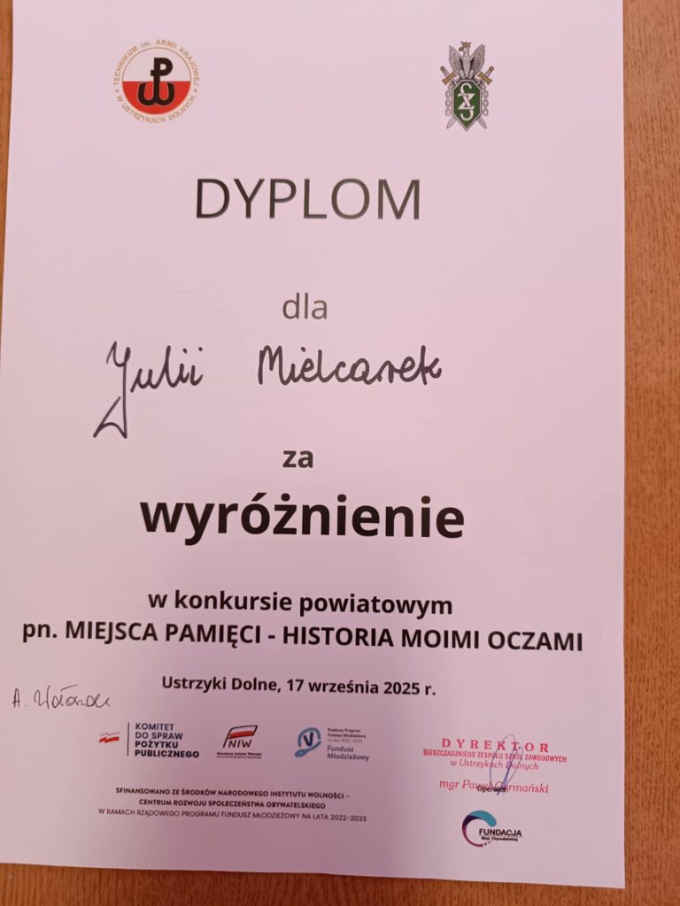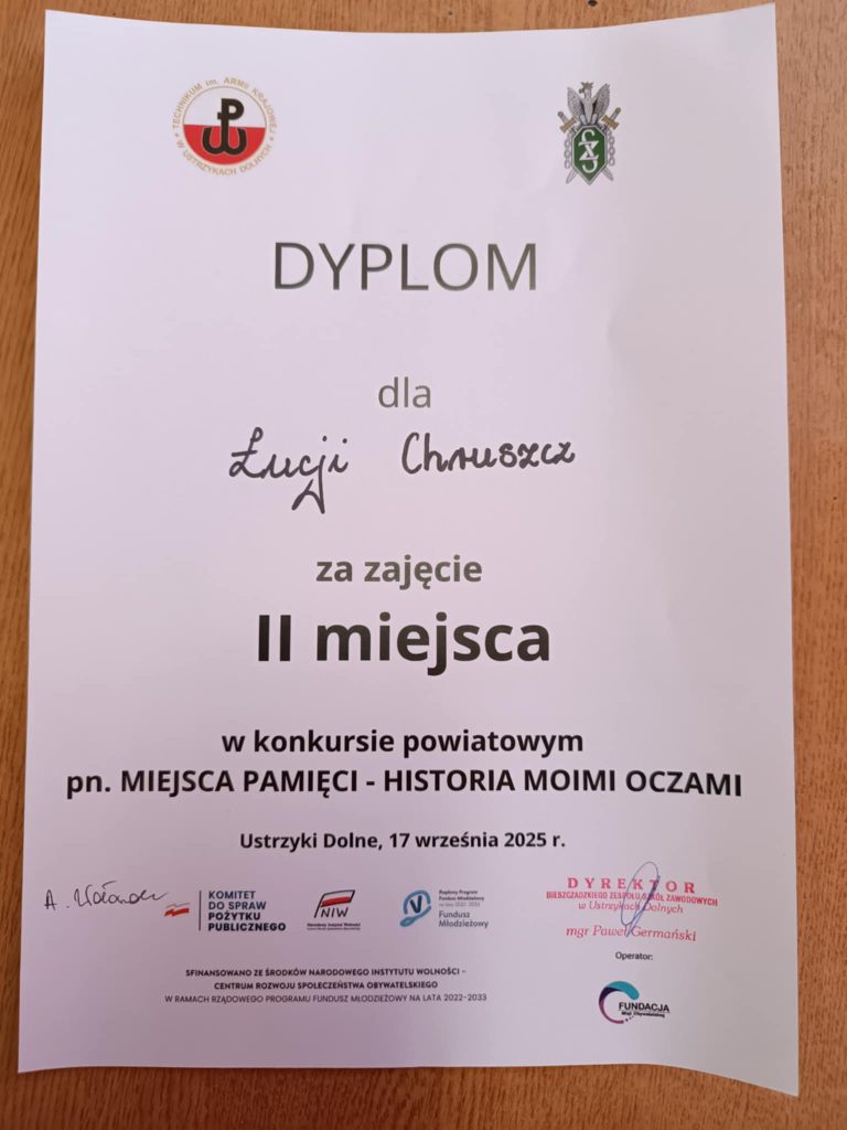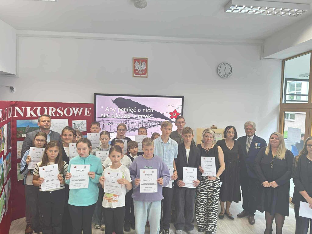Zwieńczeniem wydarzenia było rozstrzygnięcie konkursu plastycznego „Miejsca pamięci – historia moimi oczami”. Na konkurs wpłynęło wiele prac z całego powiatu. Tym bardziej miło jest nam ogłosić, że drugie miejsce zajęła Łucji Chruszcz z naszej szkoły, a wyróżnienie otrzymała – Julia Mielcarek reprezentująca również Szkołę Podstawową w Lutowiskach.