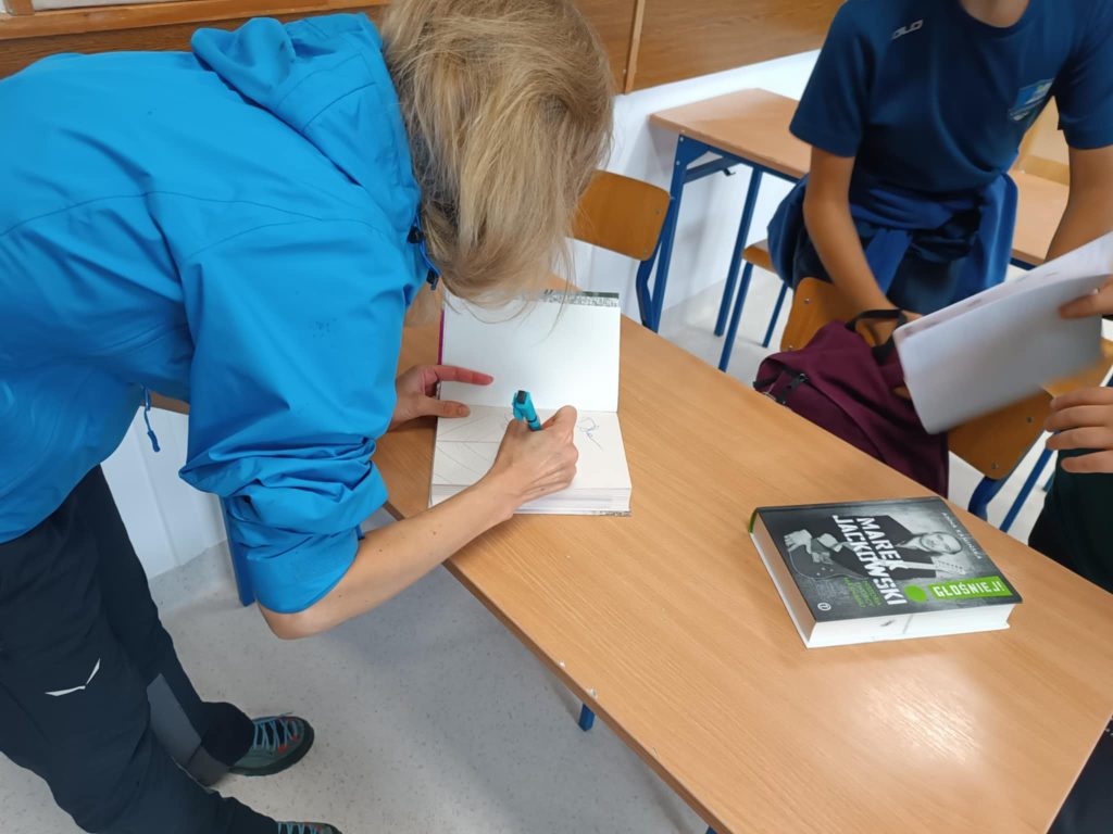 Pani Anna Kamińska pojawiła się u nas tylko na chwilę, ale uczniowie klasy VII mieli okazję porozmawiać z autorką, zadać kilka pytań i i zdobyć autografy. Dowiedzieliśmy się, że ukazała się jej kolejna książka „Nie dopytuj się”, w której opisuje Bieszczady – piękne, surowe, baśniowe i wybrane przez niezwykłe kobiety, między innymi: Zofię Komedową, Marię Kownacką czy Joannę Hasiorową. Wszystkie one wpisały się w to miejsce, wszystkie czegoś w Bieszczadach poszukiwały – nowego początku, wolności, zrozumienia.