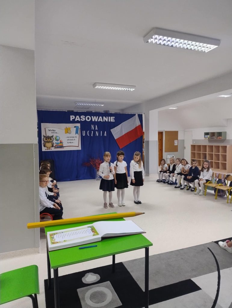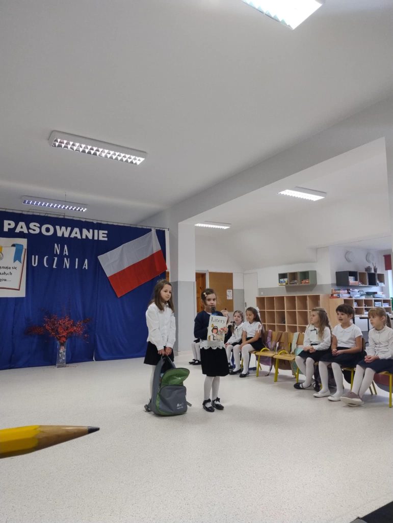 Po części artystycznej nastąpiła ceremonia ślubowania i pasowania. Dyrektor szkoły, p. Joanna Pełdiak, dużym ołówkiem, dokonała symbolicznego pasowania na ucznia dzieci klasy pierwszej.