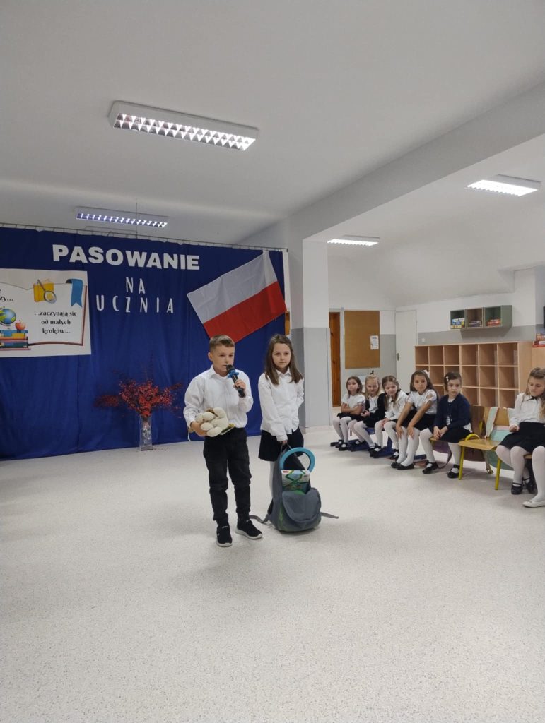 W pięknie udekorowanej sali, odświętnie ubrani uczniowie zaprezentowali program artystyczny pt. „Mój przyjaciel plecak”, w którym to poszukiwali odpowiedzi na pytania- Co się mieści w szkolnym plecaku i dlaczego tyle waży?
