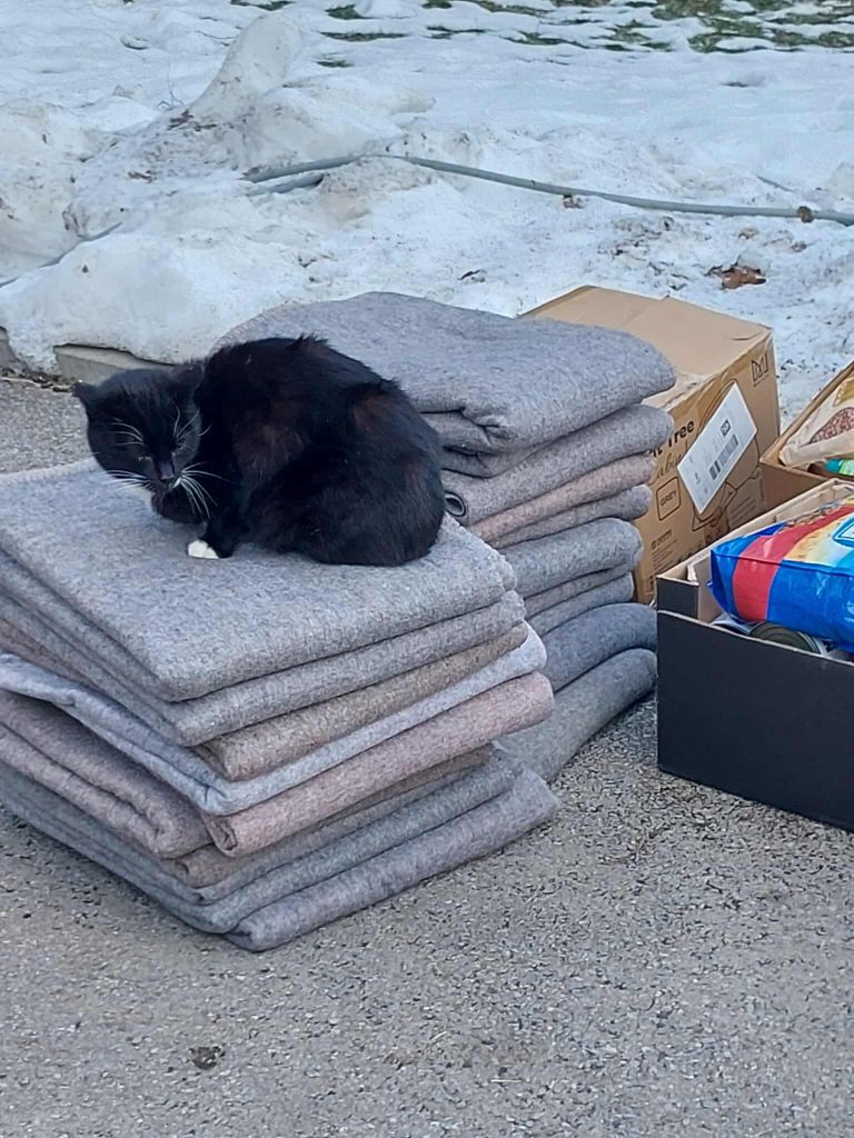Zebrano ponad 250 kg karmy suchej, mokrej, zabawki, podkłady, drapak i koce, które od pierwszego wejrzenia pokochały koty, zajmując na nich swoje pozycje.