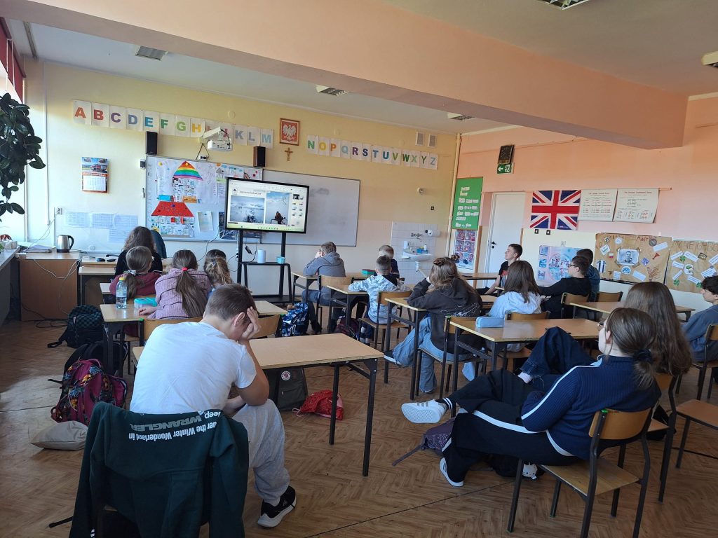 Zajęcia zostały zrealizowane w ramach projektu LIQUIDICE, badającego wpływ zmian klimatu na lód, śnieg, wieloletnią zmarzlinę oraz dostępność wody pochodzącej z kriosfery. Lekcja miała interaktywną formę – uczniowie aktywnie uczestniczyli w spotkaniu, rozwiązując zadania z wykorzystaniem telefonów. 🌍
