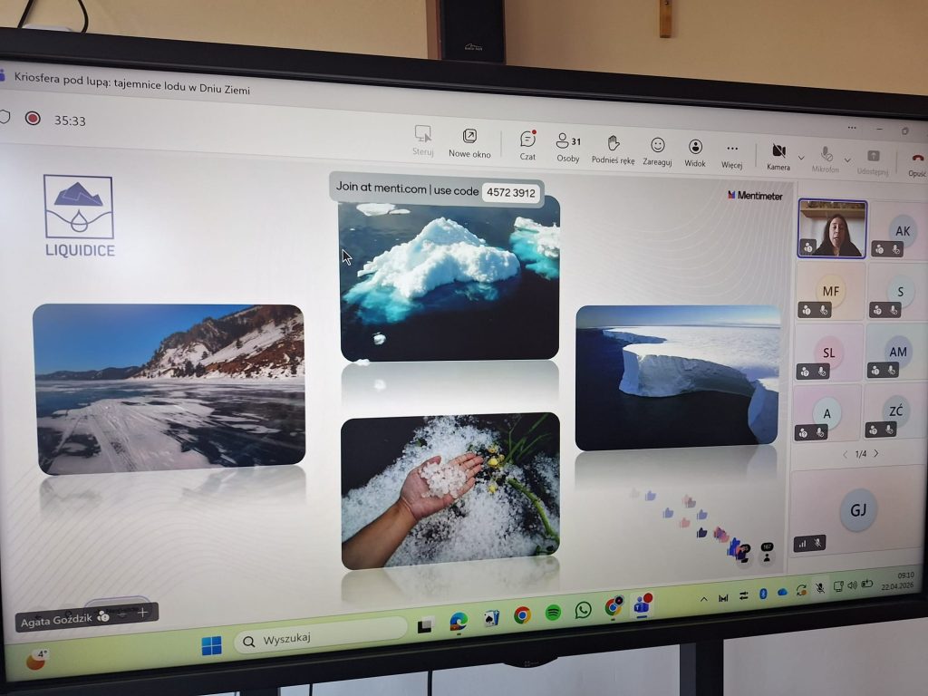 ❄️ Z okazji Dnia Ziemi, w środę 22.04.2026 r., uczniowie klas 4 i 7 uczestniczyli w wyjątkowej lekcji online pt. „Kriosfera pod lupą: tajemnice lodu w Dniu Ziemi”. Spotkanie poprowadziła dr Agata Goździk, adiunktka w Instytucie Geofizyki PAN, która opowiedziała o różnych rodzajach lodu, jego znaczeniu dla naszej Planety oraz o tym, dlaczego badania nad lodem są tak istotne.
