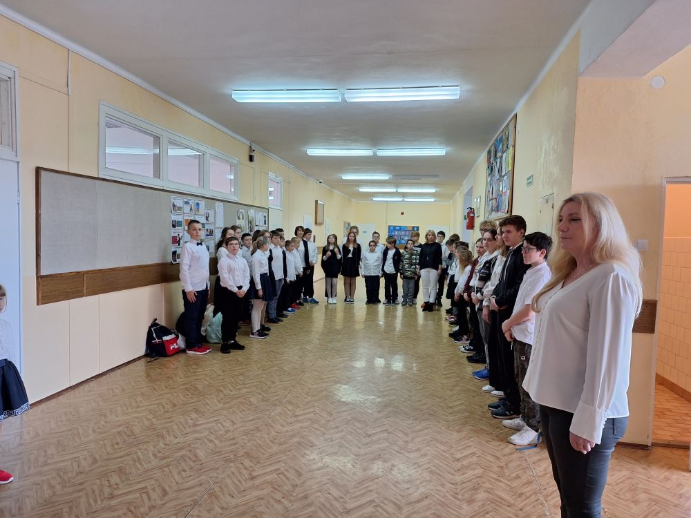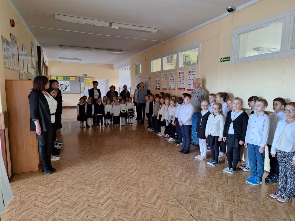 Jak co roku, od kilku lat społeczność uczniowska naszej szkoły w przeddzień Święta Niepodległości włącza się we wspólne, narodowe śpiewanie Hymnu Polski. Dlatego w dniu 10 listopada 2023r. także w naszej szkole odbyło się uroczyste odśpiewanie hymnu państwowego, w ramach akcji „Szkoła do hymnu”. O symbolicznej godzinie 11:11 uczniowie w ,,małej szkole” zgromadzili się na korytarzu szkolnym by w odświętnej atmosferze odśpiewać 4 zwrotki Mazurka Dąbrowskiego. Całość patriotycznego spotkania poprzedziła przemowa p. dyrektor Beaty Krukowskiej .