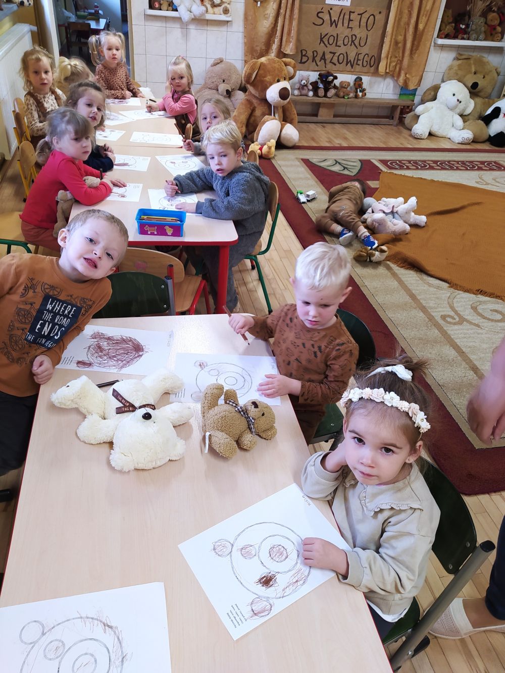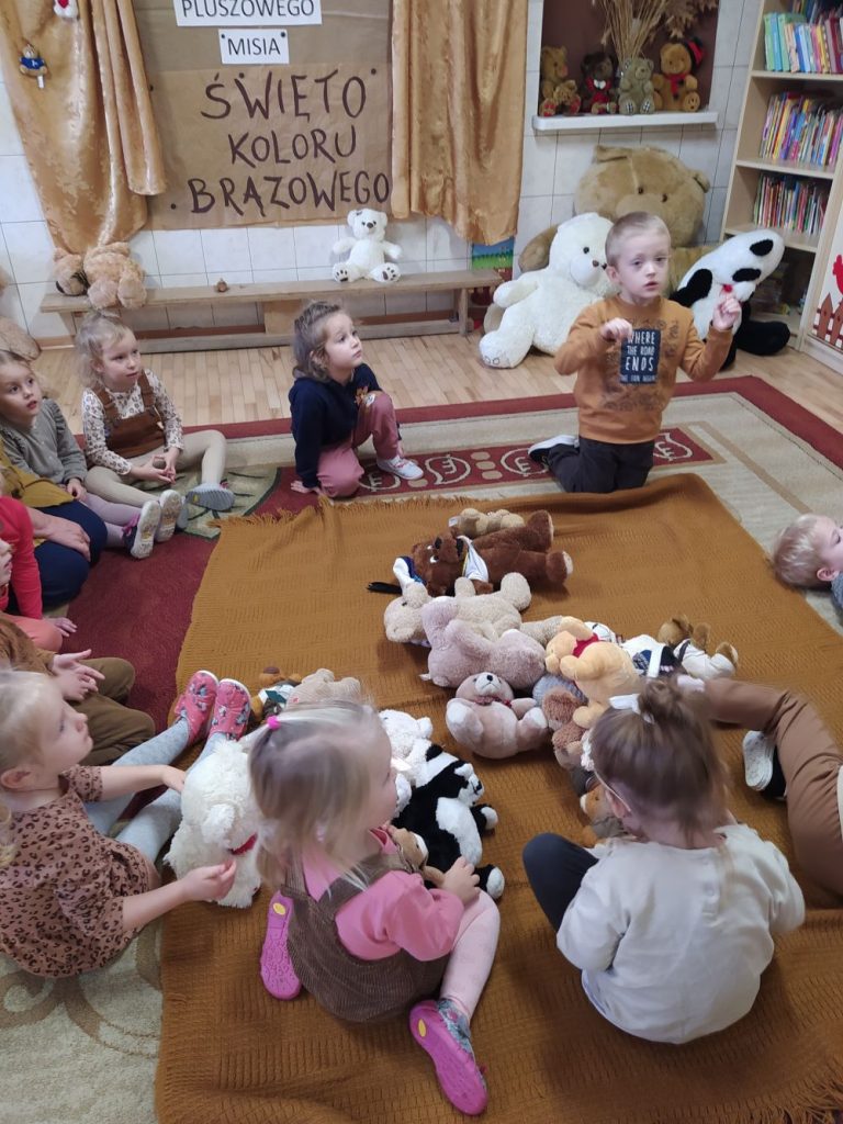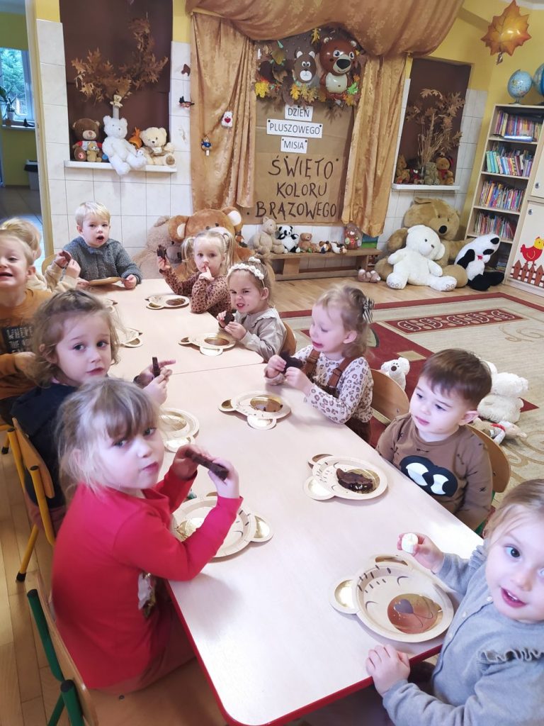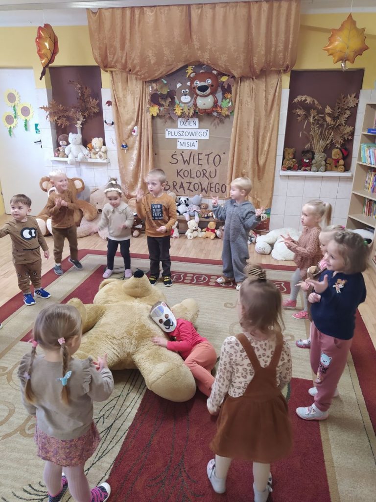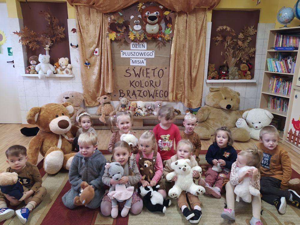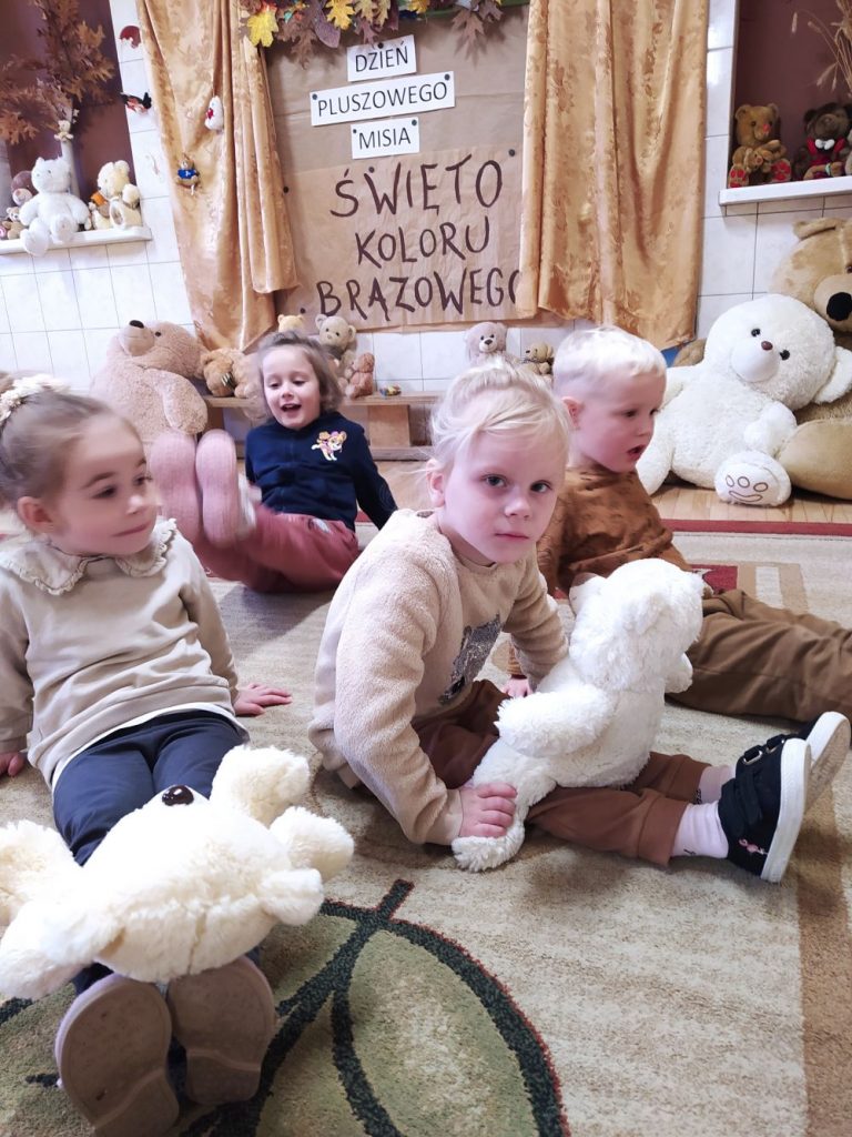 Z tej okazji 17 listopada przedszkolaki z Punktu Przedszkolnego uczestniczyły w obchodach „Światowego Dnia Pluszowego Misia”. Tego dnia dzieci ubrane na brązowo przyszły na zajęcia ze swoim ukochanym pluszowym misiem. Wszystkie były śliczne i wyjątkowe. Razem z nimi ćwiczyły, tańczyły, podróżowały po różnych krainach, rozwiązywały zagadki – o misiach, rysowały jego portret i poznały interesującą historię jego święta. Oczywiście nie mogło zabraknąć misiowego przysmaku na misiowym talerzyku – przepysznego czekoladowego ciasta. Na koniec przedszkolaki obiecały, że zawsze będą szanowały swoje misie. Uroczystość zakończyła się wręczeniem dzieciom dyplomów PRZYJACIELA PLUSZOWEGO MISIA.
